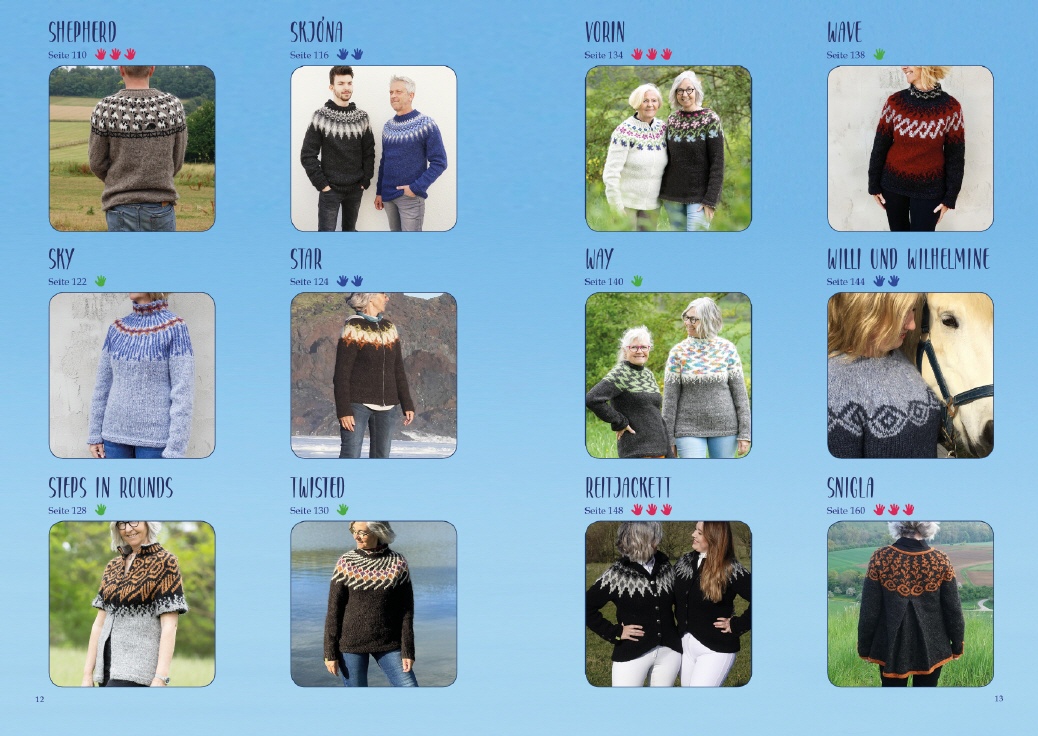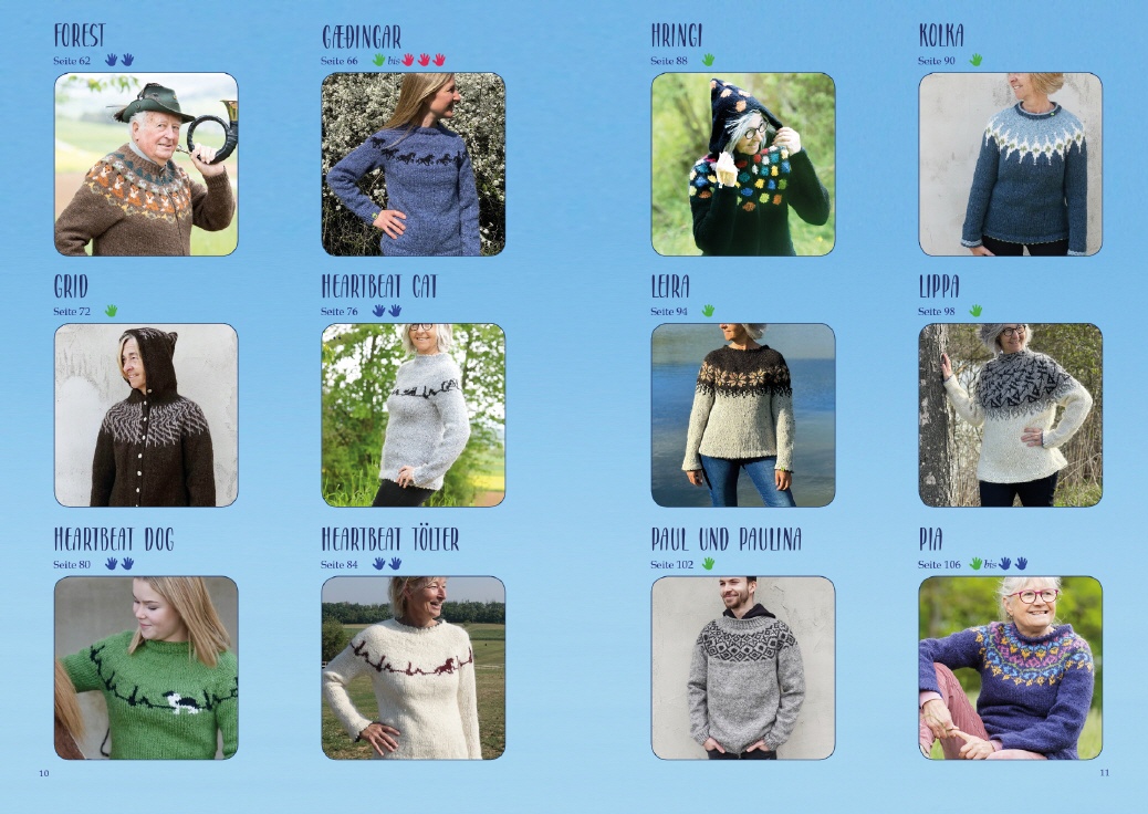 Die Modelle werden mit isländischer Lopi Wolle gestrickt und können sowohl mit Álafoss als auch mit Léttlopi gestrickt werden.
