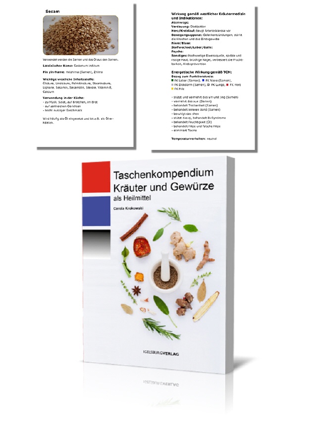 Die meisten Kräuter und Gewürze unterstützen die Verdauung, haben aber noch weitere Wirkungen auf den Körper. Somit können die Kräuter und Gewürze begleitend zur Therapie von Erkrankungen eingesetzt und natürlich auch prophylaktisch gezielt genutzt werden. Außerdem ist es wichtig, die Eigenschaften der Kräuter und Gewürze im Kontext der traditionellen chinesischen Medizin (TCM) zu kennen. Zahlreiche energetische Eigenschaften und Wirkungen auf die unterschiedlichen Funktionskreise sind für jedes Gewürz bzw. Kraut aufgelistet.