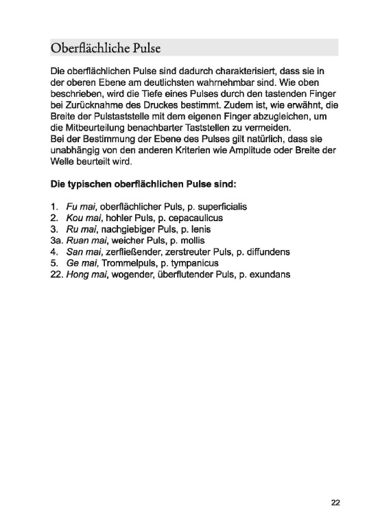 Erfahrungsgemäß ist die Pulsdiagnose für den Lernenden die geheimnisvollste und scheinbar am schwierigsten zu erlernende diagnostische Methode. Wir sind von der westlichen Medizin gewohnt, den Puls in seiner Frequenz und Rhythmus zu beurteilen, haben jedoch Schwierigkeiten, die in der chinesischen Medizin bedeutsamen qualitativen Veränderungen zu erkennen.