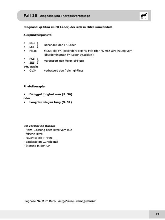 Auf der dritten Seite jeder Fallbeschreibung findet sich die TCVM-Diagnose und die Angabe der Akupunkturpunkte, die behandelt werden könnten. Dabei sollte der Leser unbedingt beachten, dass nicht immer alle Akupunkturpunkte gleichzeitig behandelt werden sollten.